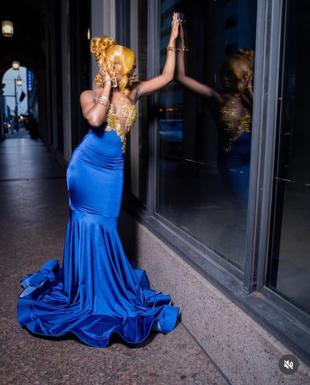 a custom royal blue gown adorned with intricate gold appliqué detailing. Designed to shape the body like art in motion, blending elegance, and confidence.
